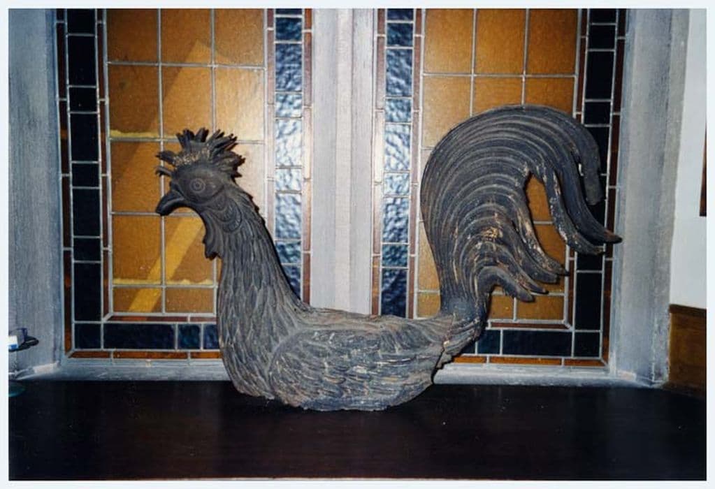 Réalisé en deux moitiés à peu près symétriques, le coq est amputé de sa base. Des traces de dorures sont encore visibles.