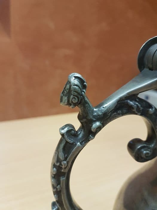 Cruche à pied circulaire mouluré, panse galbée, anse ornée de motifs en relief, couvercle à poussoir et bouton.