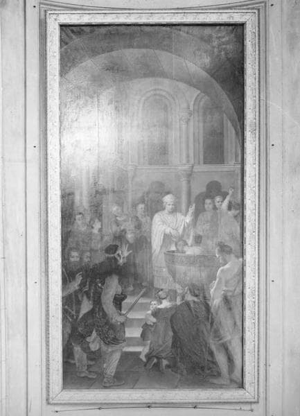 tableau : intrusion du roi Childéric d'Austrasie dans le baptistère où saint Léger baptiste Clovis