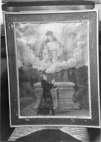 tableau ex-voto : un prêtre agenouillé priant la Vierge et l'Enfant sur un nuage, cadre