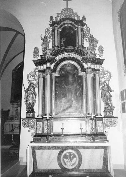 autel, retable, 6 statues, 2 tableaux : saint Nicolas de Bari, saint Nicolas de Tolentino, sainte Marguerite, sainte Madeleine, saint Christophe, putti