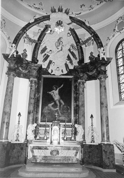 autel, gradin, tabernacle, 6 chandeliers, 8 statues : deux anges adorateurs, quatre putti céroféraires, deux putti, retable, baldaquin, tableau : saint Sébastien soigné par sainte Irène (maître-autel)