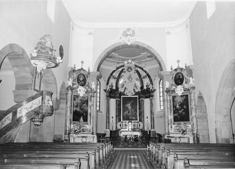 autel ; gradin d'autel ; tabernacle ; chandelier d'autel (6) ; statue (8) ; retable ; baldaquin d'autel ; tableau