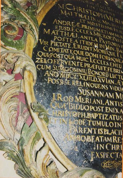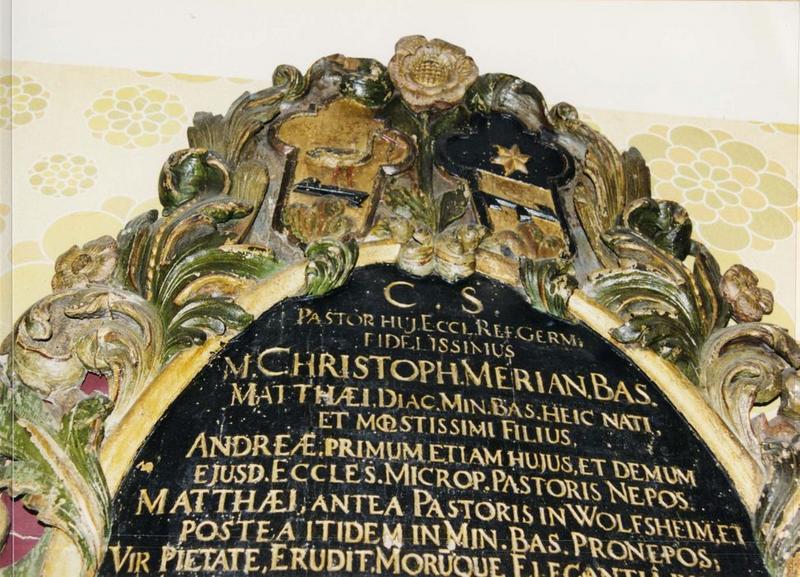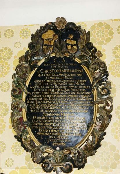 Inscription (gravée, latin) : C.S. PASTOR HUJ. ECCL. REF. GERM FIDELISSIMUS M. CHRISTOPH. MERIAN . BAS. MATTHAEI.DIAC.MIN.BAS.HEIC NATI ET MOSTISSIMI FILIUS ANDREAE PRIMUM ETIAM HUJUS. ET DEMUM EJUSD. ECCLES. MICROP. PASTORIS NEPOS MATT HAEI ANTEA PASTORIS IN WOLFSHEIM. ET. POSTE A ITIDEM IN MIN. BAS PRONEPOS, VIR PIETATE, ERUDIT MORUQUE ELEGANTIA INSIGNIS COMITATEQUE DOMITORISQUE OMNIBUS CHARUS ; QUI POSTQUA HUIC ECCLES. EHEU. SALTEMPER IX MENS. ZELOFERVENTE PRAEFUIT FEBRIMALIGNA CORREPTUS CUM SUMOOMNIU BONORU LUCTUIN DNOOBDORMIVIT. ANO MDCCCXLIII.D.XV IAN.AET.AN.XXX.MENS.V. POSTSE (?) RELIQUENS VIDUAM MOSTISSIMAM SUSANNAM MERIAN J.ROD MERIANI, ANTIST. BASIL. FILIAM. QUAE BIDUOPOST ENIXAEST FILIUM, QUI CHRISTOPH. BAPTIZATUSITERUDECESSIT, ET IN ? ODE TUMULOINTER BRACHIA DEF. PARENTIS PLACIDE QUESCIT. AMBOBEATAM RESURRECTIONE IN CHRISTO EXSPECTANTES.