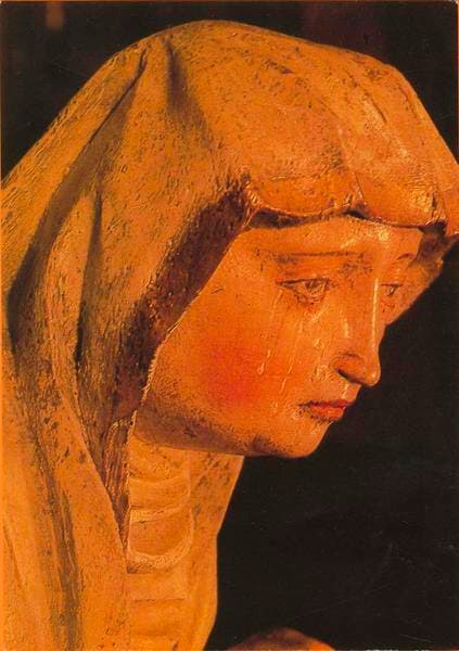 Le pèlerinage de Dusenbach remonte au 13e siècle et fut fondé par Egelolphe II de Ribeaupierre ; il fit construire une première chapelle après 1221. Dévasté au 14e siècle, le pèlerinage est modifié au 15e siècle et à nouveau ravagé par les Suédois en 1632. Reconstruction et essor à partir de 1656. En 1793, le Directoire demande la destruction de Dusenbach. Dusenbach restera en ruine pendant un siècle jusqu'à la reconstruction du pèlerinage par l'architecte Winckler de Colmar à l'instigation de Mgr Fritzen en 1894. Une première statue de la Vierge aurait été ramenée d'Oreint par Egelolphe seigneur de Ribeaupierre au retour d'une croisade vers 1221. Il s'agissait probablement d'une Vierge à l'Enfant, la dévotion à la Vierge douloureuse étant plus récente (14e). Certains auteurs ont voulu identifier cette première statue avec la Vierge miraculeuse d'Altöting en Bavière. En 1475, un inventaire cite deux statues de la Vierge à Dusenbach : deux statues y ont existé, la Vierge de Pitié actuelle serait-elle antérieure à cette date ? Une autre thèse attribue la commande de cette dernière Vierge à Maximin II de Ribeaupierre vers 1494, au retour d'un pèlerinage en terre sainte. Dans cette hypothèse, la statue pourrait avoir été réalisée par le sculpteur Lorentz de Ribeauvillé, attesté comme 'bildschneider und burger zu Rappoltsweiler ' en 1498. La Vierge de Pitié fut cachée plusieurs fois : en 1632 lors de la destruction du pèlerinage par les Suédois, pendant la Révolution jusqu'en 1811 et entre 1940 et 1945. Les Seigneurs de Ribeaupierre ont choisi la Vierge de Pitié comme patronne des ménétriers d'Alsace dont ils étaient les 'rois' et protecteurs. Une autre confrérie dénommée Maria Reidt, Marie du Secours ou de l'assistance se plaça également sous la protection de la Vierge de Dusenbach. Un photographie publiée en 1934 montre la sculpture votive coiffée d'une couronne et revêtue de l'ample robe rebrodée qui était de coutume dans les pèlerinages mariaux. Une copie assez conforme a été réalisée ces dernières années et placée sur un autel latéral de l'église de la Bienheureuse Vierge Marie. La Vierge de Pitié de Dusenbach ne doit pas sa notoriété à ses qualités plastiques très moyennes.