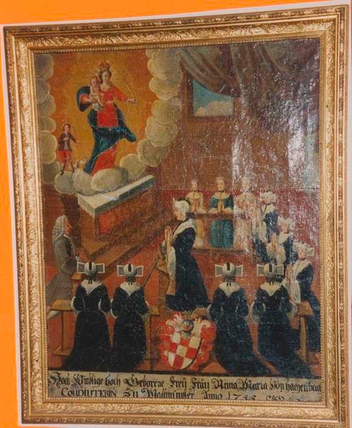 tableau ex-voto et son cadre : la Vierge à l'enfant apparaissant à l'abbesse Anne-Marie de Hagenbach