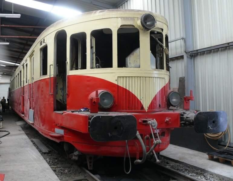 La caisse poutre est en acier avec parois et toiture en tôle d'acier doux (les parties basses des tôles latérales sont fortement corrodées, il en est de même de la base de certains profilés de caisse). La peinture rouge et crème avec moustaches d'extrémité est conforme aux couleurs d'origines. Le compartiment voyageur à classe unique offre 70 places assises accessibles par deux plates-formes. Les sièges (en très mauvais état), à disposition de cinq places de front (3 + 2), sont en cuir couleur thé sur supports en tubes chromés (cet équipement, longtemps classique, peut à ce jour être remplacé à l'identique (tubulure et cuir) par récupération sur autorails unifiés X 4300). Les mécanismes de baies sont en place (mais les vitres sont toutes à remplacer). Le sol est un plancher de bois recouvert d'un linoléum. Les luminaires (démontés) sont au complet. A l'extrémité A se trouve un compartiment à bagages et un WC. A l'extrémité B se trouve un petit compartiment avec une banquette à cinq places. Le chauffage est assuré par radiateurs à ailettes à circulation d'eau chaude à partir d'une chaudière TA De Dietrich au coke (à retrouver).£Les installations techniques sont parfaitement symétriques, l'engin moteur est réversible avec une cabine de conduite à chaque extrémité. L'appareillage pneumatique et électro-pneumatique des cabines (bien qu'en partie démonté), est complet. Les caisses sont munies à leurs deux extrémités des organes de choc et de traction (tampons et crochet à tendeur) du type allégé unifié, d'un accouplement de conduite générale, d'un câblot de jumelage ainsi que de trois projecteurs. Le freinage est assuré par un classique équipement à air comprimé direct et automatique et par l'action de deux sabots sur le bandage de chaque roue. Les deux bogies de type Görlitz sont identiques avec traverse danseuse centrée et suspensions primaires et secondaires par ressorts à lames. Les essieux sont à roues monoblocs avec boîtes à rouleaux SKF. Chaque bogie supporte un moteur diesel Saurer BXDS de 6 cylindres en ligne, paliers à rouleaux, injecteurs et pompe Bosch, avec embrayage, boite à 4 vitesses CV2 Mylius synchronisée et pont-moteur inverseur sur l'essieu intérieur, ce qui nous donne la disposition motrice 1A-A1 (A: essieu moteur, 1: essieu porteur). Les deux ensembles sont commandés électro-pneumatiquement depuis chacune des deux cabines. A chaque moteur est associé un petit compresseur d'air (un seul subsiste).