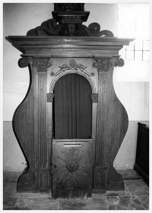 Confessionnal en bois composé d'une baie en plein-cintre encadrée de deux pilastres corinthiens. Deux ailerons latéraux complètent l'ensemble.