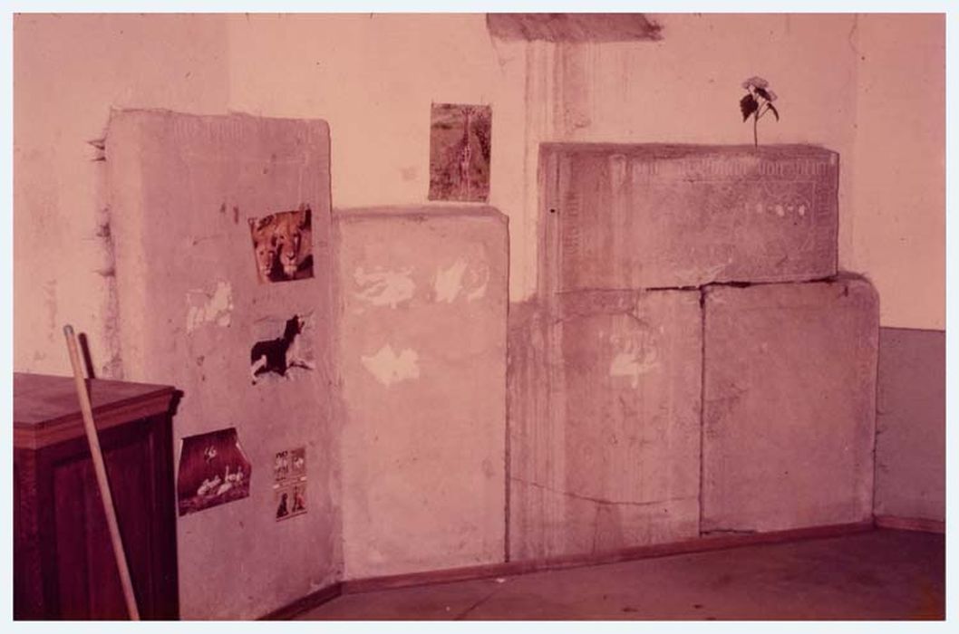 Les dalles, retirées de l'ancienne église détruite en 1914-191, ont été scellées contre un mur de la crypte aménagée sous le choeur en 1927.