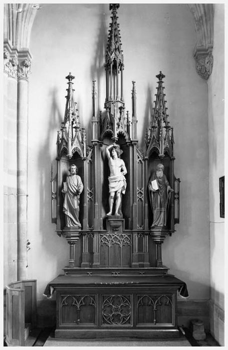 Autel et retable de style néo-gothique, abritant trois statues : saint Sébastien, saint Pierre et saint Paul. Le tombeau est rectangulaire et orné de remplages et d'une rosace. Retable composé de trois niches surmontées de lanternons.