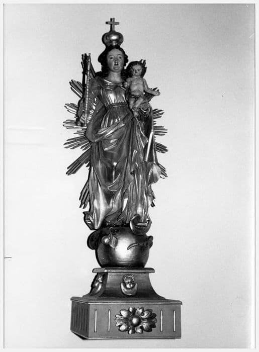 Vierge à l'Enfant ; globe ; serpent ; croix ; couronne ; sceptre ; rayons lumineux ; angelot ; croissant de lune