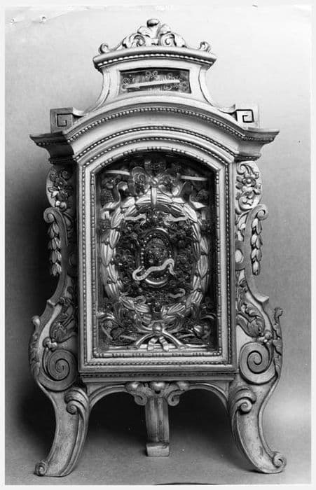 Reliquaire-monstrance avec niche vitrée, sur trois pieds. La niche est encadrée de deux accolades végétales. Derrière la vitre, la lunule est ceinte d'une couronne de lauriers et de fleurettes. Cette niche est couronnée d'un fronton cintré au-dessus duquel se situe une autre petite niche vitrée.