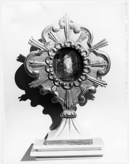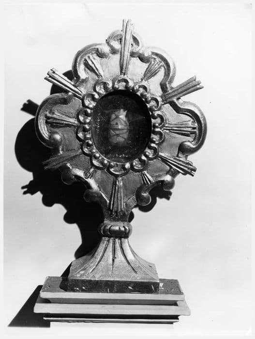 Reliquaires aux pieds rectangulaires incurvés. Le corps, immédiatement au-dessus, est composé d'une lunule ovale entourée d'une nuée chantournée et ornée de rayons lumineux.