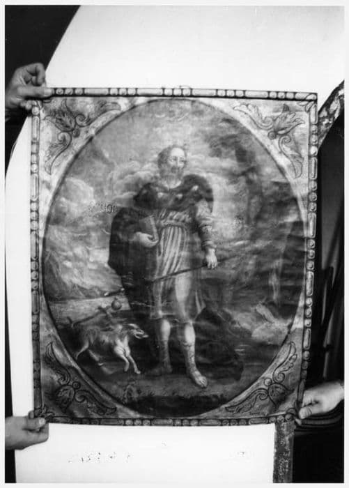 saint Sébastien ; saint Roch ; flèche ; arbre ; village ; architecture ; chien ; livre ; bourdon