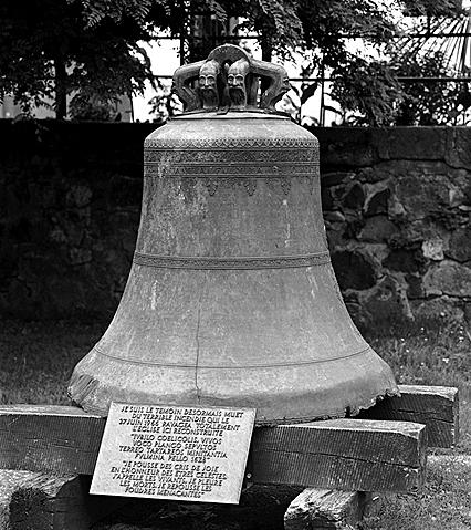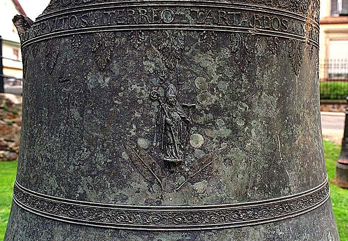 Cloche brisée au niveau de l'épaule et du cerveau, déformée à la pince et balafrée sur l'image de la Vierge.