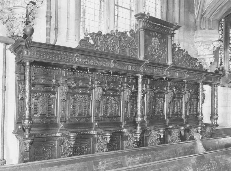 Stalles au décor architecturé composé de arcades à bossages, pilastres avec fausses embrasses à goupille et fenêtres à crossettes.