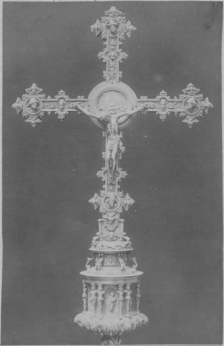 Croix à branches égales à section rectangulaire, renflées en demi-cercle latéralement en leur milieu et terminées par un disque sur lequel posent latéralement trois têtes de chérubins. Une tête saillante garnit le médaillon de chaque extrémité, et les lobes intermédiaires. Face : Christ couronné d'épines, attaché par trois clous. Dans le disque qui outrepasse l'intersection des bras, les trois croix du calvaire. Revers : même décoration. La Vierge à mi-corps allaitant d'Enfant Jésus dans le disque central. Noeud cylindrique cantonné de six paires de termes détachées, portant une corniche lisse, que surmonte un cylindre bas en retraite accosté de six consoles détachées : six statues d'apôtres debout dans des niches entre les termes. Les termes reposent sur un tore orné de têtes en relief à l'aplomb de chacune des leurs paires. Douille à côté sous un court balustre fauillagé, inséré sou un culot.