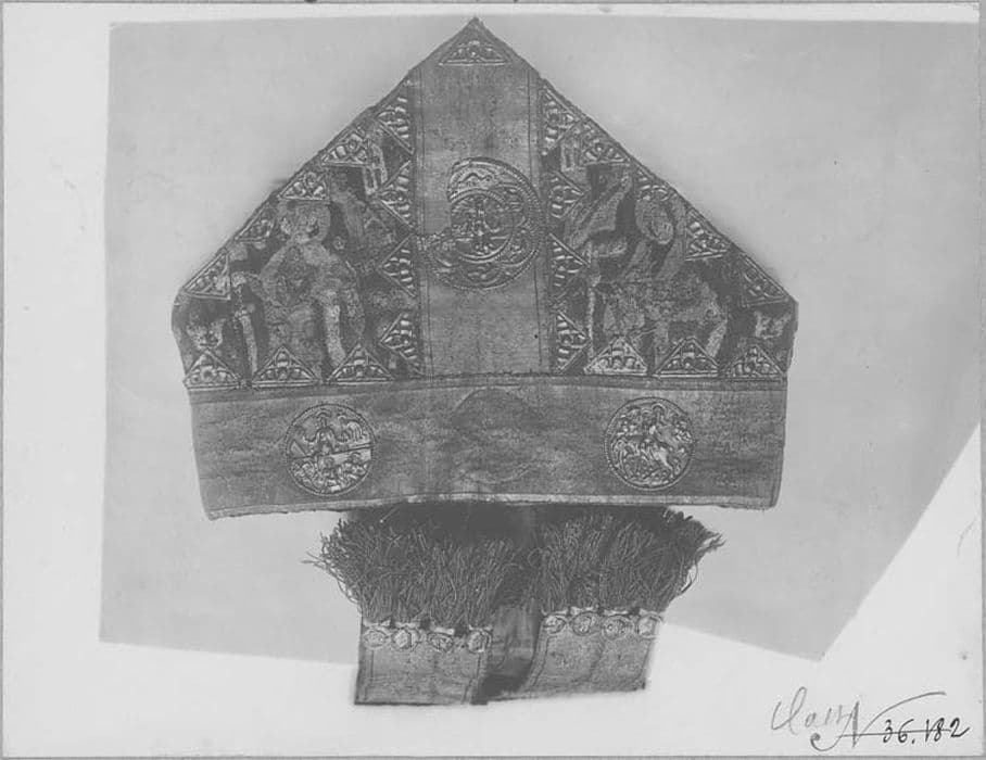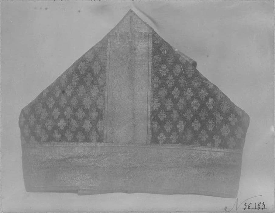 Sur le devant, saint Pierre et saint Paul brodés au point fendu. Larges orfrois tissés d'or. Plaques métalliques de forme triangulaire au bord des orfrois : trois plaques circulaires portant au repoussé La Vierge à !'Enfant, la Fuite en Egypte, le Christ de la Résurrection.