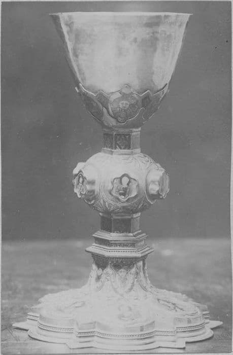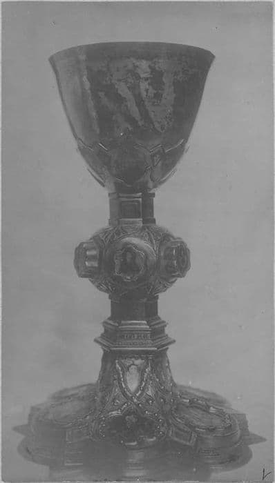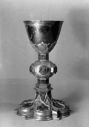 Coupe ovoïde portée sur une fausse coupe ornée d'émaux translucides représentant des têtes de chérubins. Noeud orné de six boutons circulaires décorés de figurines en émaux peints. Pied hexagone à lobes à redans divisés par des entrelacs saillants et gravés.