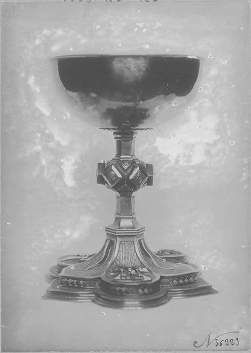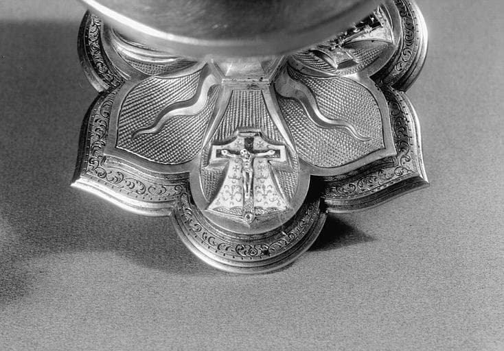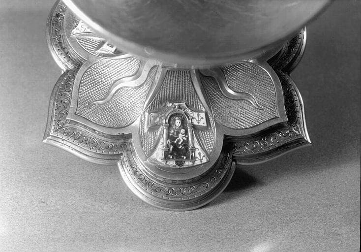 Large coupe hémisphérique. Pied à trois lobes circulaires alternant avec trois lobes ogivaux. Sur les lobes circulaires, Crucifixion, Vierge à l'Enfant. Agathe de forme ovoïde sur laquelle est gravée une Pietà. Noeud orné de six boutons carrés.