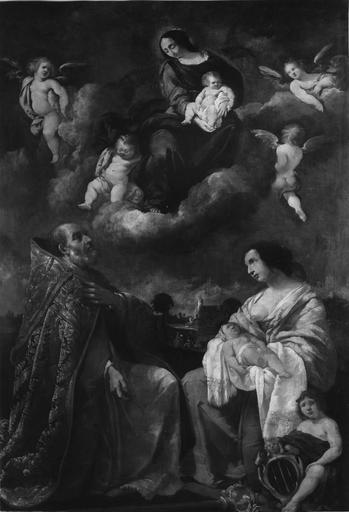 tableau : La Vierge, un saint et la Charité (Saint Fortunat intercédant auprès de la Vierge pour la guérison d’un enfant malade)
