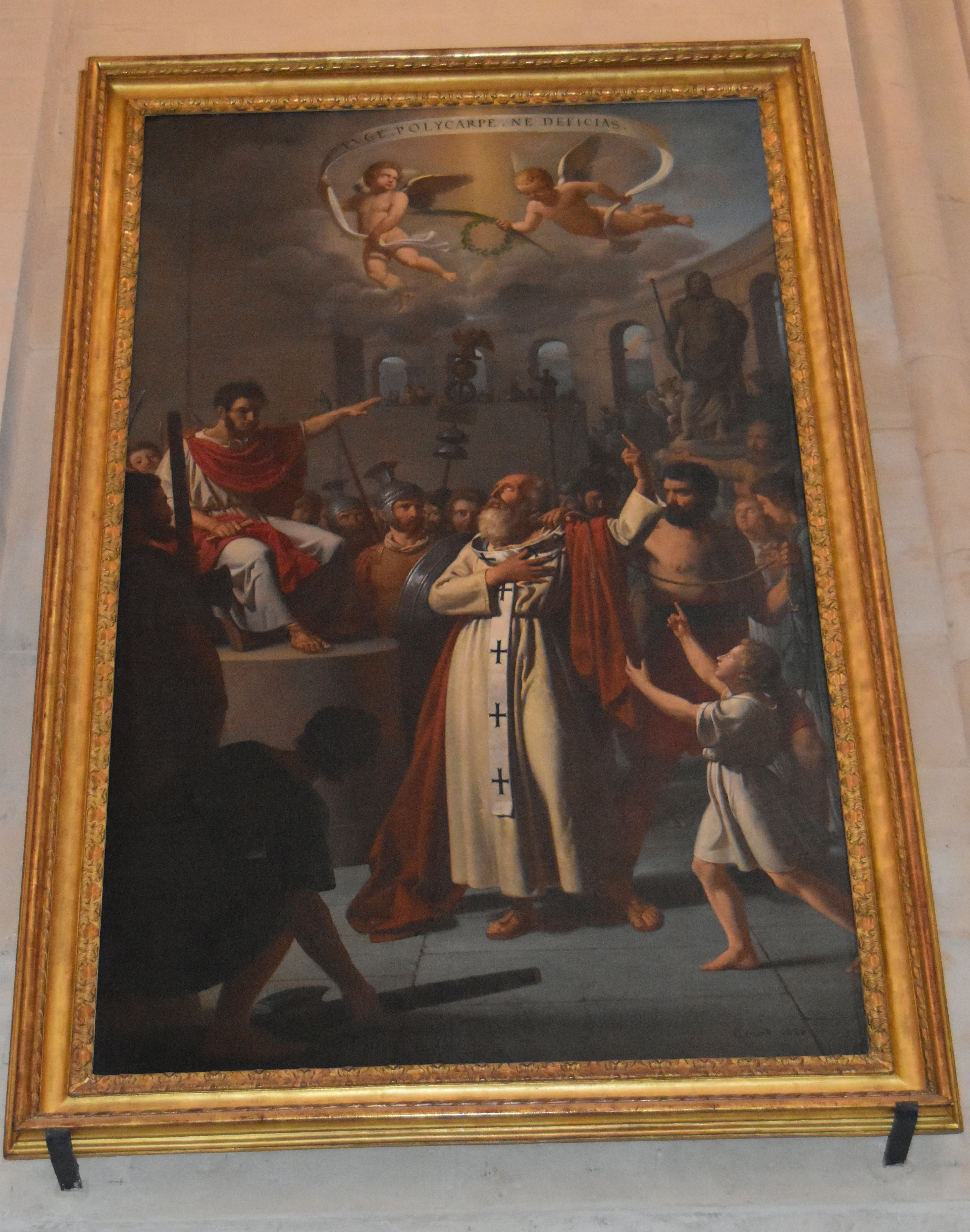 Inscription concernant l'iconographie (latin, sur l'oeuvre) : FUGE POLYCARPE NE DEFICIAS (sur le phylactère). Signature, date : GENOD 1827.