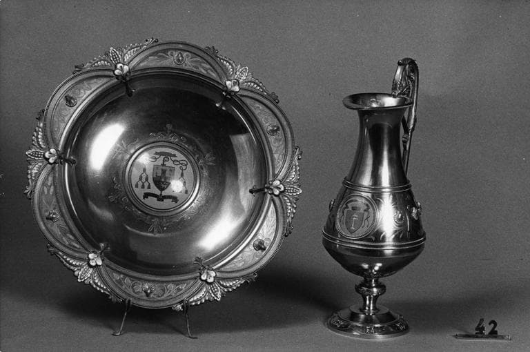 Aiguière n°42. Métal doré sans poinçon, type néo-gothique. Pied décoré de festons et de fleurons émaillés. Panse décorée de roseaux et de tournesols gravés, de coquilles Saint-Jacques gravées et appliquées. Décor 1900 rehaussé d'émail blanc. Au centre un médaillon avec une croix au-dessus de l'inscription. En dessous, un écusson avec une croix double qui est treflée et surmontée d'une couronne comtale. L'anse est formée d'une espère de monstre qui avale une tige : le monstre se termine par une crosse néo-gothique. Plateau n°42bis. Terminé par des lobes avec des coquilles Saint-Jacques.