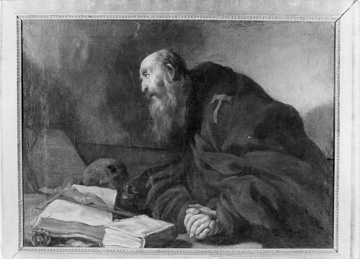 saint Antoine (en buste, de profil) ; table (crâne, livre, crucifix, cloche)