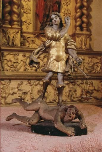 7 statues : saint Jean l'Evangéliste, saint Michel terrassant un démon, 3 évêques, 2 anges porte-cierges