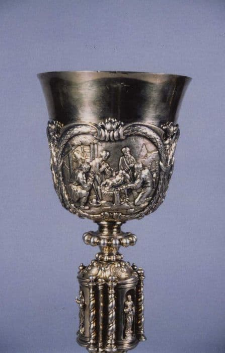 Pied à large rebord à profil en doucine constitué d'une petite moulure rapportée au bord extérieur et d'une moulure plus large ciselée d'arabesques et de têtes d'anges. Dessus de pied décoré de représentations dans des médaillons (Crucifixion, Jésus aux rochers, la Cène). Sur la tige, entre deux collerettes perlées, noeud allongé sous forme de niches abritant les figures en pied du Christ, Vierge à l'Enfant, saint Pierre ; les niches sont séparées par des doubles colonnettes torsadées. Sur la fausse coupe : Annonciation, Nativité, Adoration des Mages. Sur la patène : Mise au tombeau.