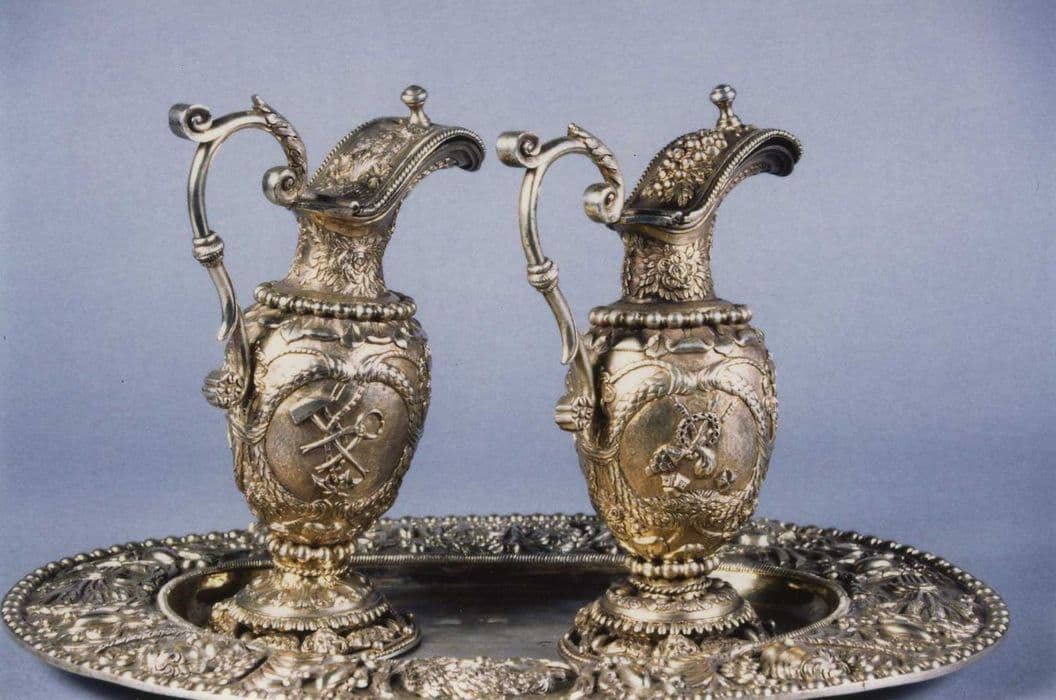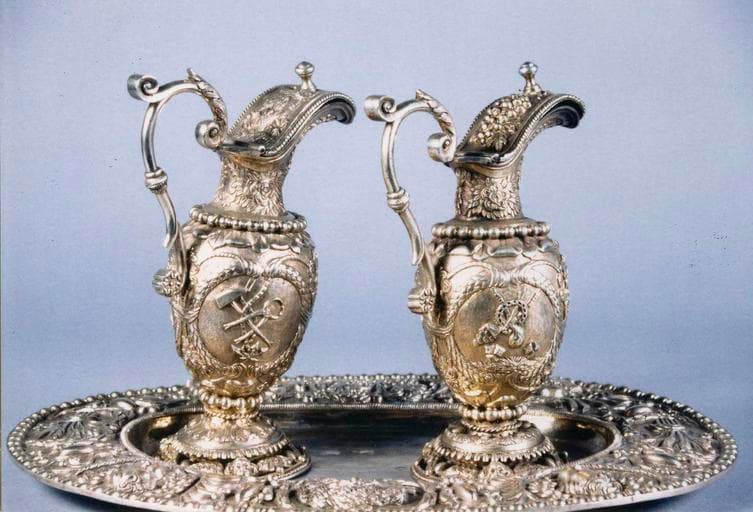 Instruments de la Passion sur la panse des burettes. Sur le bord du plateau, Agneau pascal, épis de blé et sarments de vigne séparés par des têtes d'anges. Frise d'astragale sur le pourtour.
