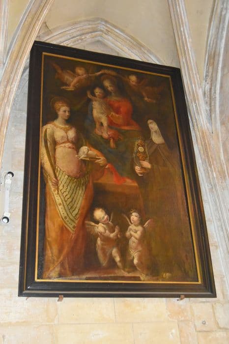 Huile sur toile représentant une Vierge à l'Enfant trônante, encadrée par sainte Agnès et sainte Claire, debout, tenant chacune leurs attributs. A leurs pieds sont agenouillés deux angelots en prière.