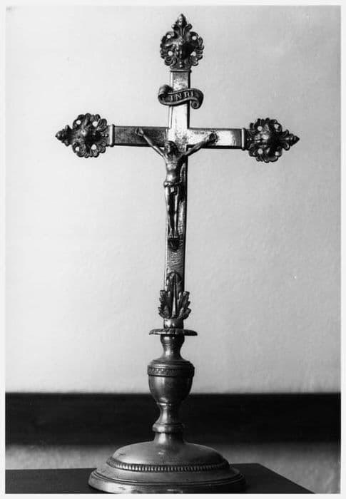 Croix plate. Christ et titulus rivés à la croix. Aux extrémités, fleurons à têtes d'angelots, au pied, feuillage. Base : coupole ovale et pied à trois renflements, décorée d'un rang de feuilles de lotus gravées et d'un rang de billettes.