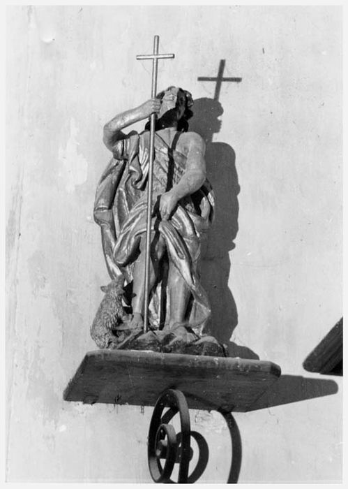 Les attributs actuels du saint le confirme comme saint Jean-Baptiste. Certains voient saint Roch. Saint Jean-Baptiste est vêtu de son costume traditionnel. De la main gauche il soulève un pan de son vêtement, découvrant ses jambes (pour montrer sa plaie s'il s'agit de saint Roch). De la main droite, il tient une croix, à ses pieds du côté gauche un mouton (ou un chien s'il s'agit de saint Roch).