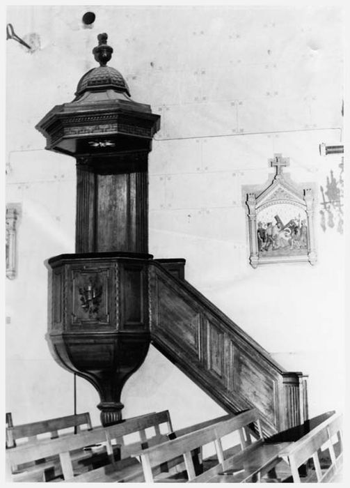 Cuve à cinq pans coupés. Abat-voix terminé par une coupole couverte d'écailles simulées et surmontée d'un pot.