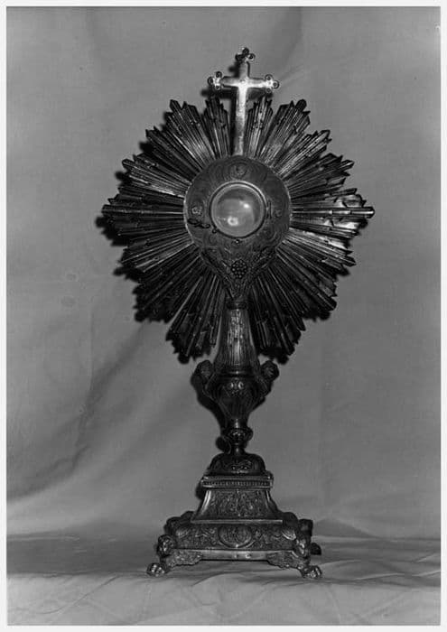 rayons lumineux ; croix ; Pélican mystique ; Agneau mystique ; blé ; angelot ; raisin ; vigne ; calice ; Lavement des pieds ; Les Evangélistes