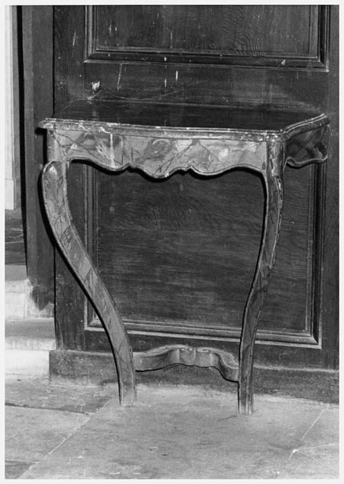 Tables d'applique à deux pieds en console. Les pieds sont réunis par deux branches en forme de volutes. Elles sont recouvertes de marbre, l'une rouge, l'autre gris veiné. Le bois a été peint imitation marbre.
