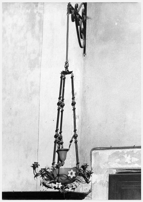 Lustres du croisillon sud : coupe en opaline bleue surmontée d'un vase et entourée d'une guirlande de fleurs blanches avec six bougeoirs. Lustres du croisillon nord : coupe en opaline blanche, même décor, fleurs de couleur métallique. Par des cordons perlés, ils sont accrochés à une potence en fer forgé décorée en volutes.