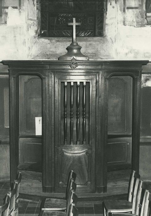 Porte centrale : partie supérieure ajourée de quatre barreaux moulurés, partie inférieure décorée d'un panneau mouluré et chantourné aux angles. Parties latérales évidées, moulurées, entablement mouluré. Le confessionnal est surmonté d'une croix reposant sur un socle.