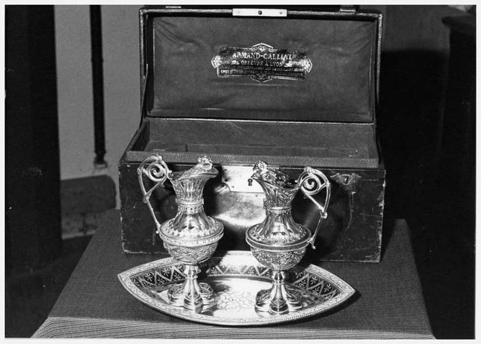 Burettes au pied polylobé avec un décor ciselé. Motifs dentelés, décor losangé, filigranes, fleurettes émaillées. La panse de la burette est ceinturée d'une bande émaillée, rouge pour l'une, bleue pour l'autre. Le couvercle est décoré de raisins. Plateau : sur le marli, décor de filigrane.