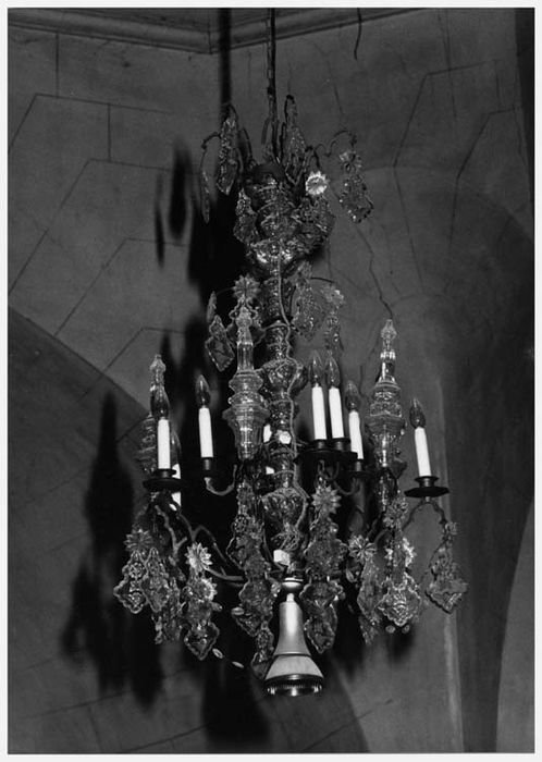 Trois grands lustres composés d'une couronne centrale en bronze doré décorée de motifs à répétition. Elle comporte une range de dix bougies et de dix poignards et se termine par une petite couronne. Les deux couronnes sont reliées par des chutes de perles et des pendeloques. Le petit lustre est formé de deux rangées de bougies et pendeloques gravées autour d'un axe habillé de cristal.