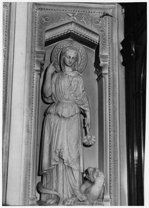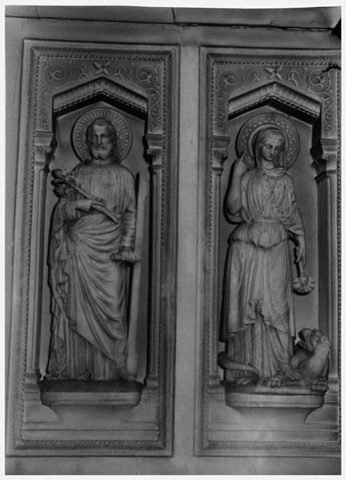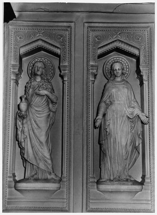 Statues insérées dans des niches en forme de dais à pilastres corinthiens.