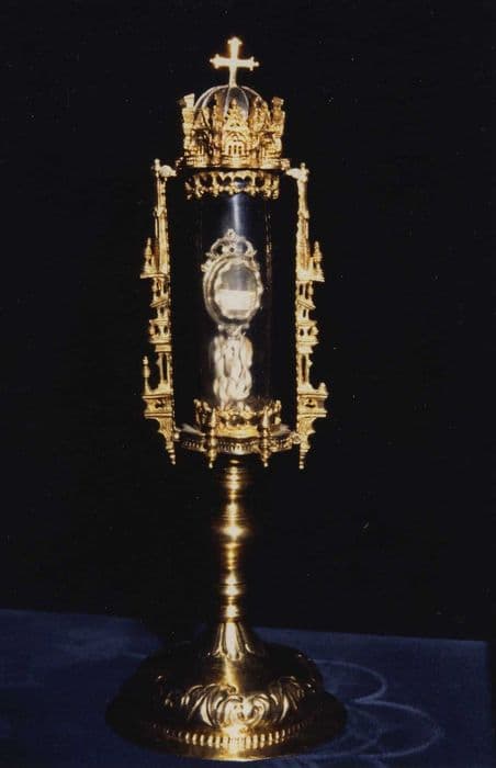 Base ornée d'un décor de rocaille. Partie haute composée d'une capse en verre circulaire surmontée d'un dôme gothique, lui-même entouré de petits édicules de même style. Le dôme est surmonté d'une croix. La capse de verre renferme un médaillon ovale (lui-même en verre), monté sur une tige imitant des flammes. Sertie d'argent, elle laisse apparaître une relique non identifiable à l'oeil nu. Un sceau de cire rouge est apposé sur la base du médaillon.