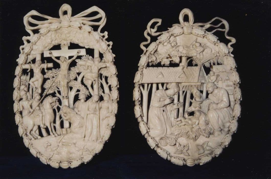 deux reliefs (plaques de reliure) : Nativité et Crucifixion