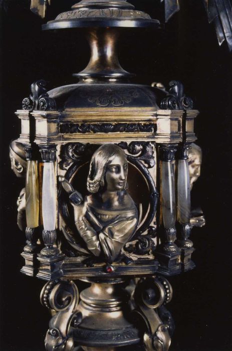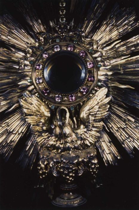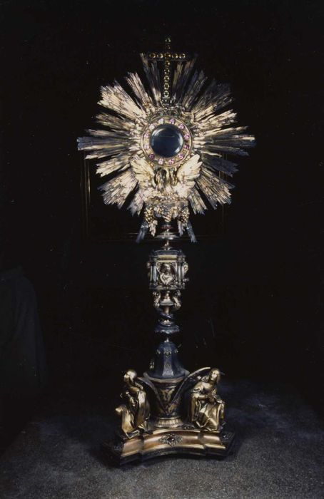 Ostensoir dominé par une croix ornée de pierres. Le socle de l'ostensoir, tripode, comporte trois statuettes. La tige comporte un noeud sphérique surmonté de quatre bustes dans des médaillons séparés par des double colonnettes en verre.