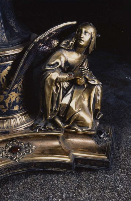 Statuettes du socle représentant des anges dans l'attitude de la prière ou de l'adoration. Un serpent s'enroule autour de la tige entre le noeud et les figures (trois femmes et un saint en buste). Sur la face principale de l'ostensoir, le pélican aux ailes déployées.