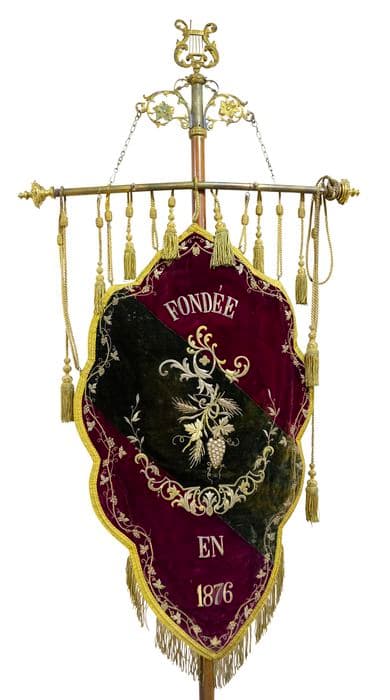 Bannière en velours rouge et noir, pièces métalliques et fils dorés, accompagnée de sa hampe et de son fourreau.