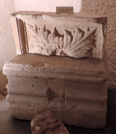 En partie supérieure, un élément d'architecture (dosseret) en pierre blanche et en partie inférieure une base de pilier en pierre.