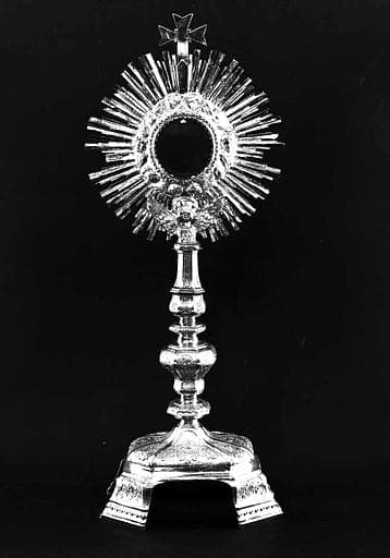 Ostensoir en vermeil dont la base octogonale a été dénaturée par une restauration abusive, qui a consisté (au 19e ou 20e siècle) à supprimer quatre côtés, pour que les quatre autres forment quatre pieds qui ont été renforcés vers l'intérieur par quatre pièces de métal maladroitement soudées. Soubassement et noeud décoré de rocailles, de fleurs, d'épis de blé, de rubans, de chaînes, irgnes, godrons et perles. Le boîtier, orné de têtes d'angelots ailés dans les nuages d'où partent des rayons, est fermé par deux entres en cristal biseauté : croix à la partie supérieure.