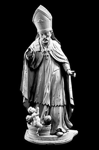 Saint Nicolas en évêque bénit les trois enfants qui ressuscitent dans le saloir. Statue de bois plein, cironnée, peinture grise sur bois naturel, sans trace de polychromie.